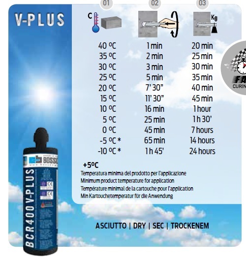 Ancora chimica Bossong BCR 400 V-PLUS bi-component din vinylester fara styrene pentru sarcini mari/ structurale, marcate CE si ETA pentru utilizare in beton.
