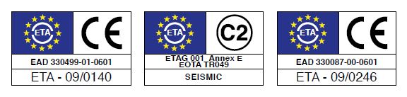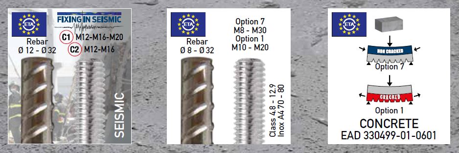 Calificare seismica conform Raportului tehnic EOTA TR049. Produsul este calificat în categoria seismică C1 pentru tije filetate cu diametre M12-M16-M20 si categorie seismica C2 pentru diametre M12-M16.