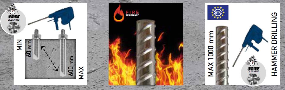 Produsul este omologat pentru fixari cu o adancime de ancorare variabilă, pentru a oferi proiectantului un grad ridicat de flexibilitate. Adancimea maxima de ancorare este de pana la douăzeci de ori diametrul nominal al tijei filetate.