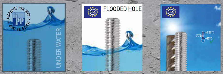 Posibilitatea de utilizare a produsului in beton uscat, umed si cu orificiu inundat (orificiu inundat numai cu bare filetate). Reactia de intarire a produsului are loc si in prezenta apei.