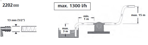 Caracteristici: - debit de maxim 1300l/h si o inaltime maxima de refulare de maxim 15 m cu furtun de 1/2''. - adancimea maxima de aspiratie este 3 m; - pompa pentru a fi utilizata se foloseste impreuna cu o masina de gaurit de minim 600 W si maxim 2800 rpm; - pompa este cu autoamorsare si nu trebuie sa functioneze mai mult de 30 de secunde fara apa, pentru a se evita deteriorarea acesteia; - pompa trebuie gresat periodic pentru a se prelungi durata de utilizare; - diametru axului de antrenare a pompei este de 6 mm; - temperatura maxima a lichidelor 40ºC.